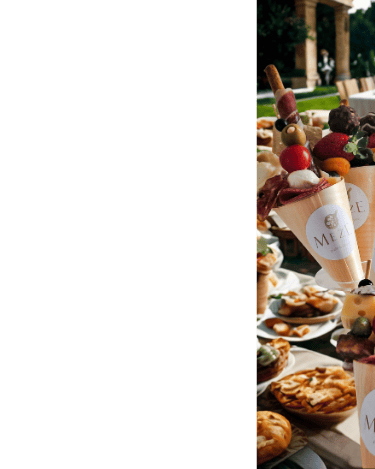 MEZE Grazing table features a curated selection of premium cheeses and artisanal cured meats, seasonal fresh fruits and vegetables, house-made spreads and dips, olives and antipasti, crusty breads and crackers, assortment of nuts and dried fruits, sweet touches like chocolates, pastries, or bite-sized desserts,